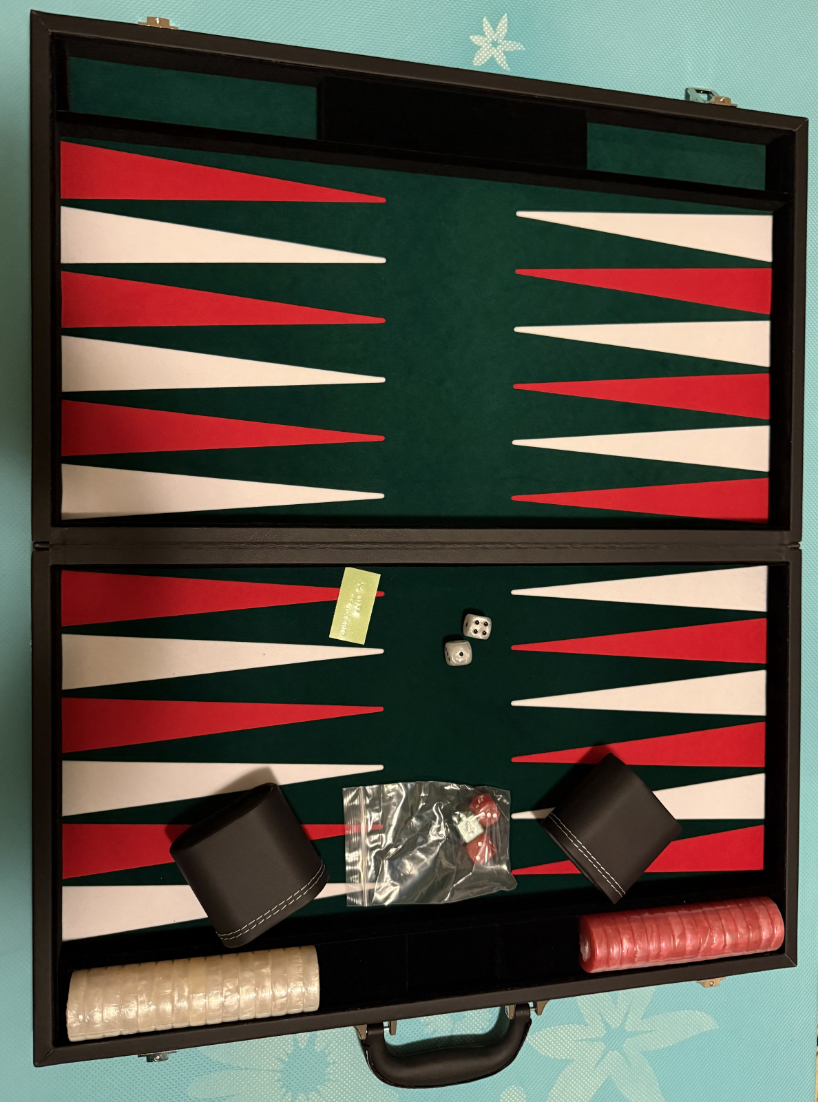 Superb joc de table/Backgammon tip servieta. Servieta din piele ecologica la exterior cu cusaturi albe si material plusat la interior, ceea ce confera jocului de table o atmosfera placuta si silentioasa comparativ cu seturile traditionale din lemn. Folosirea tonurilor contrastante (rosu, alb, verde) la interior creeaza un aspect distinctiv, de Casino si fac ca acest set de table sa fie foarte dorit si extrem de popular. Zarurile sunt marmorate, grele, bine finisate si de o calitate extrem de ridicata, vin cate doua pentru fiecare jucator plus un zar de dublare. Paharele de aruncat zaruri sunt din piele ecologica si captusite cu postav verde.
