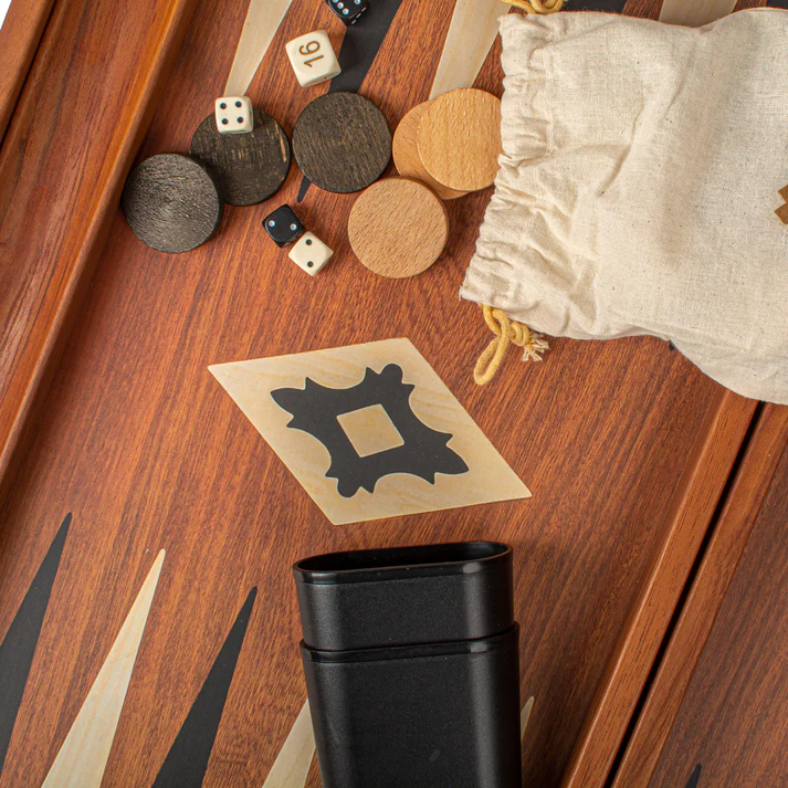 Joc de table/backgammon din lemn avand culoare cu aspect de mahon, cu tavite laterale pentru puluri, cu un design de diamant frumos in centru. Punctele sunt din stejar si mahon si se potrivesc perfect cu suprafata de joc. Acest set de table ofera o combinatie perfecta de calitate si valoare.