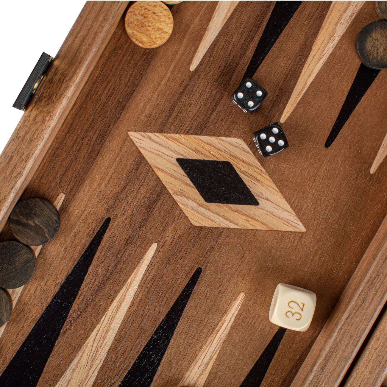 Joc de table/backgammon prelucrat manual cu furnir din lemn de nuc si puncte de furnir din stejar si de culoare negru. Acest set de table este o combinație de șah și joc de table astfel încât posesorul ei poate juca ambele jocuri. Tabla de şah este, de asemenea combinație nuc si stejar intarsiat.