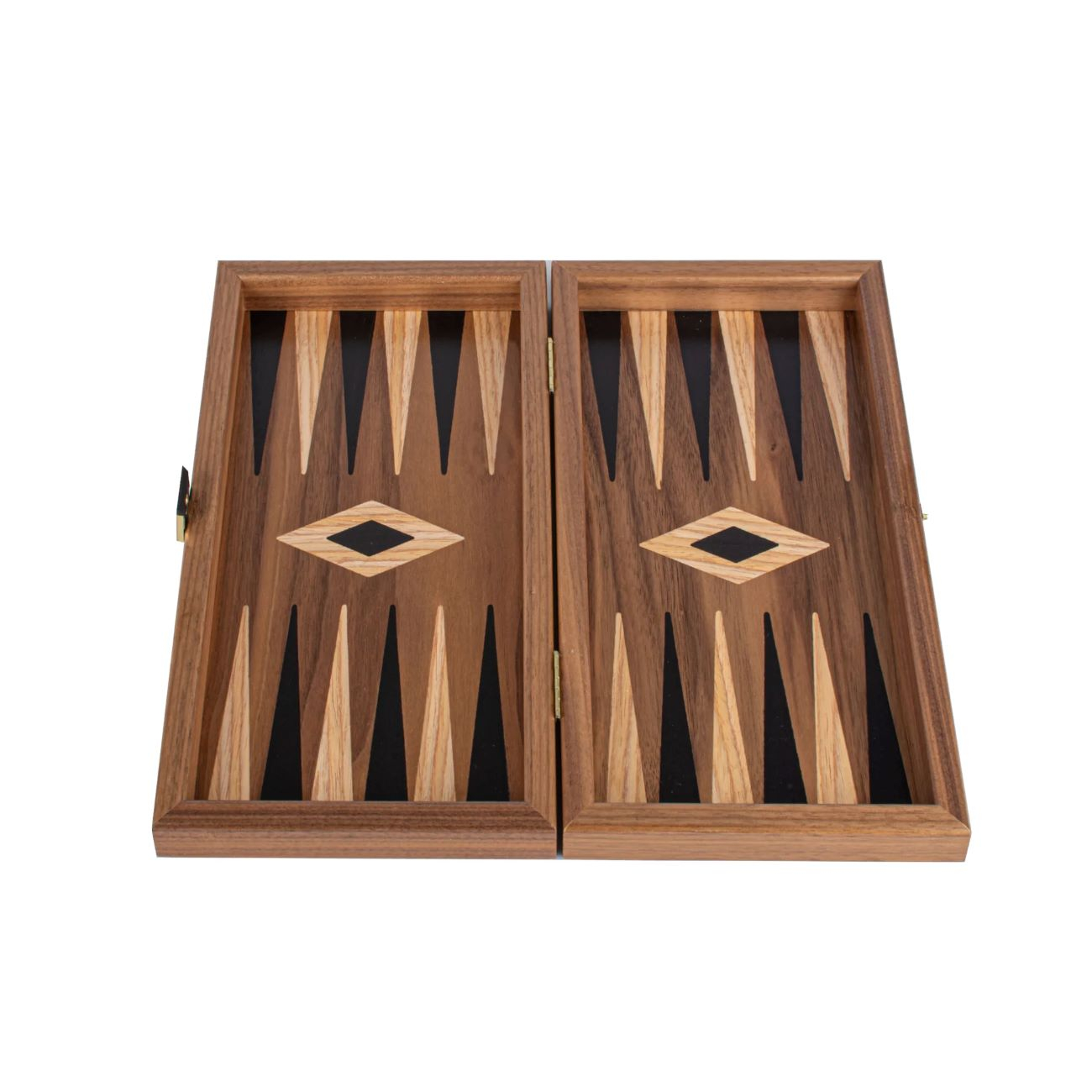 Joc de table/backgammon prelucrat manual cu furnir din lemn de nuc si puncte de furnir din stejar si de culoare negru. Acest set de table este o combinatie de sah si joc de table, astfel incat posesorul ei poate juca ambele jocuri. Tabla de sah este, de asemenea combinatie nuc si stejar intarsiat.